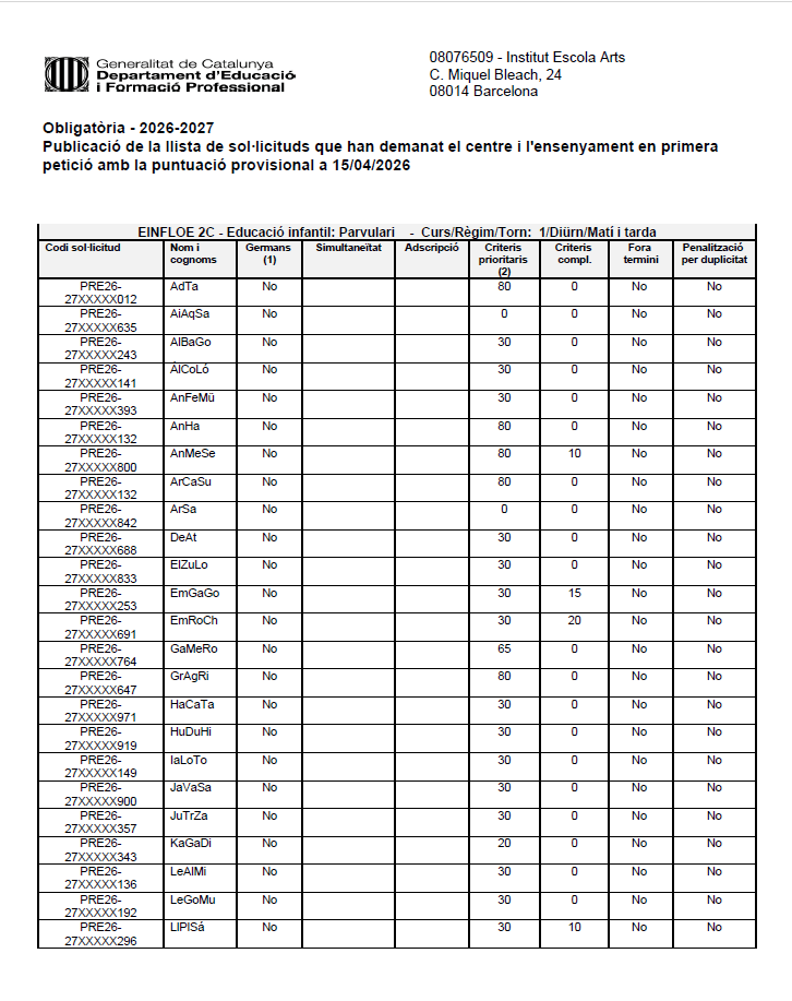 PREINSCRIPCIÓ 26-27: Publicació de les puntuacions provisionals