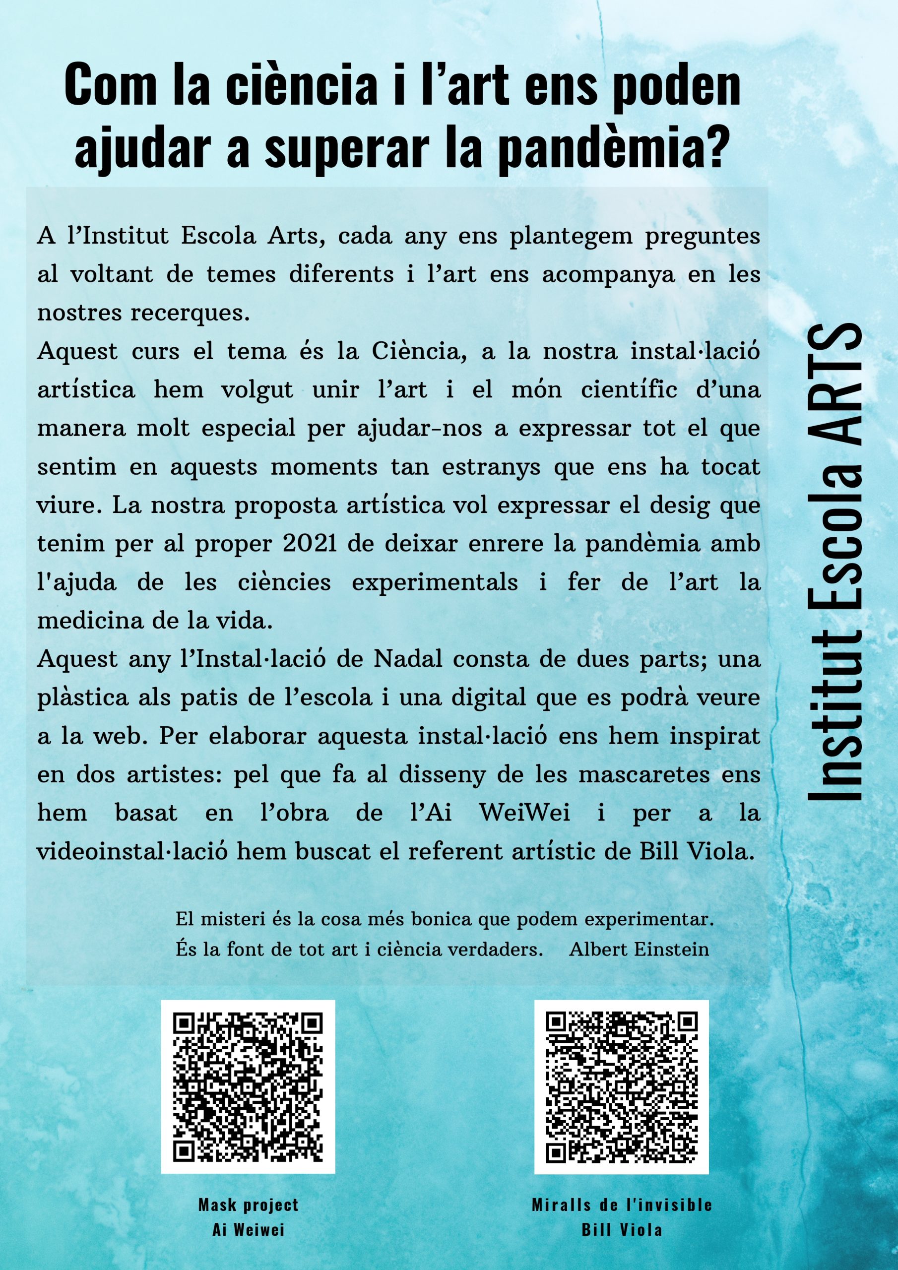 Al final del primer trimestre es realitza una instal·lació artística conjunta en un espai del centre o del barri, com ara el Casinet d’Hostafrancs. Aquesta instal·lació forma part de les activitats de motivació i té com a objectiu mostrar, a través de l’art, el tema que s’està treballant al llarg del curs.