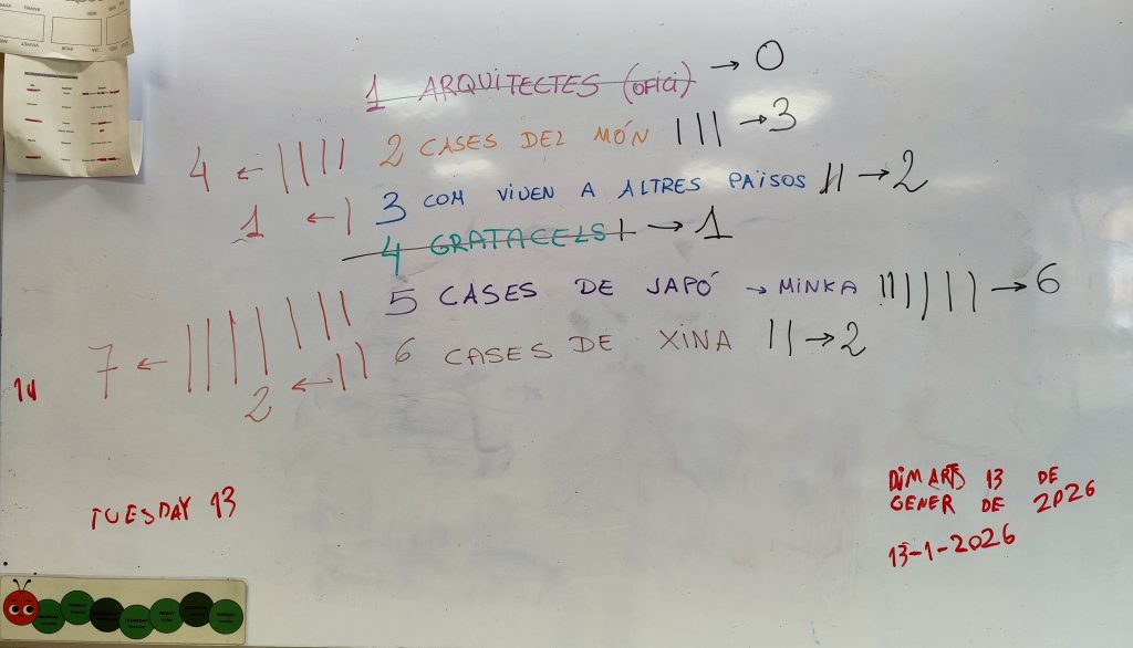 Després de fer un resum de tot el que havíem treballat relacionat amb l’Art d’habitar (cases del món, les parts de l’escola, els mapes, els oficis que intervenen en la construcció d’un edifici, etc) vam fer pluja d’idees sobre què podríem estudiar a continuació. Vam fer una llista de sis temes a la pissarra i vam fer la primera votació. Quan vam analitzar els resultats vam descartar les dues opcions menys votades. Vam tornar a votar una segona vegada amb les opcions restants.
