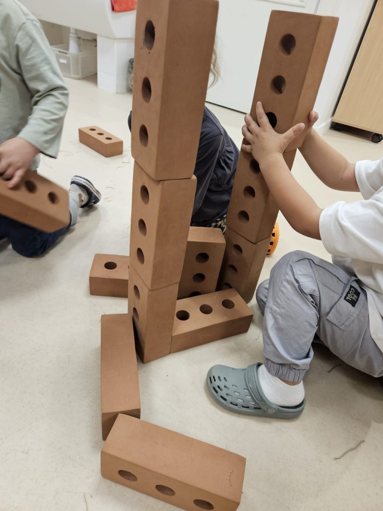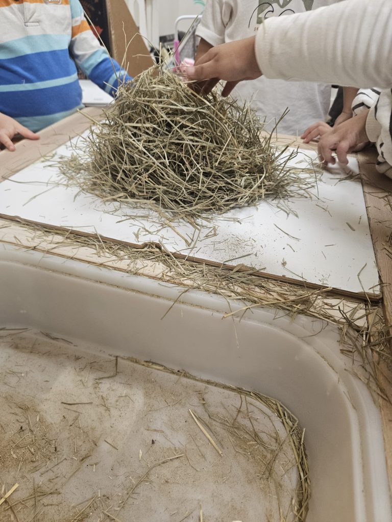 Seguint el fil d’aquest conte, vam poder experimentar amb els diferents materials de les cases dels tres porquets: La palla, la fusta i els maons. Primer, vam observar com éren aquests materials de manera conjunta, els vam tocar i vam anar explicant les diferents sensacions que se’ns despertaven amb aquests materials i descrivint com éren. Un cop els vam observar, ens vam posar mans a l’obra i per grups, vam poder construir cases per als 3 porquets!