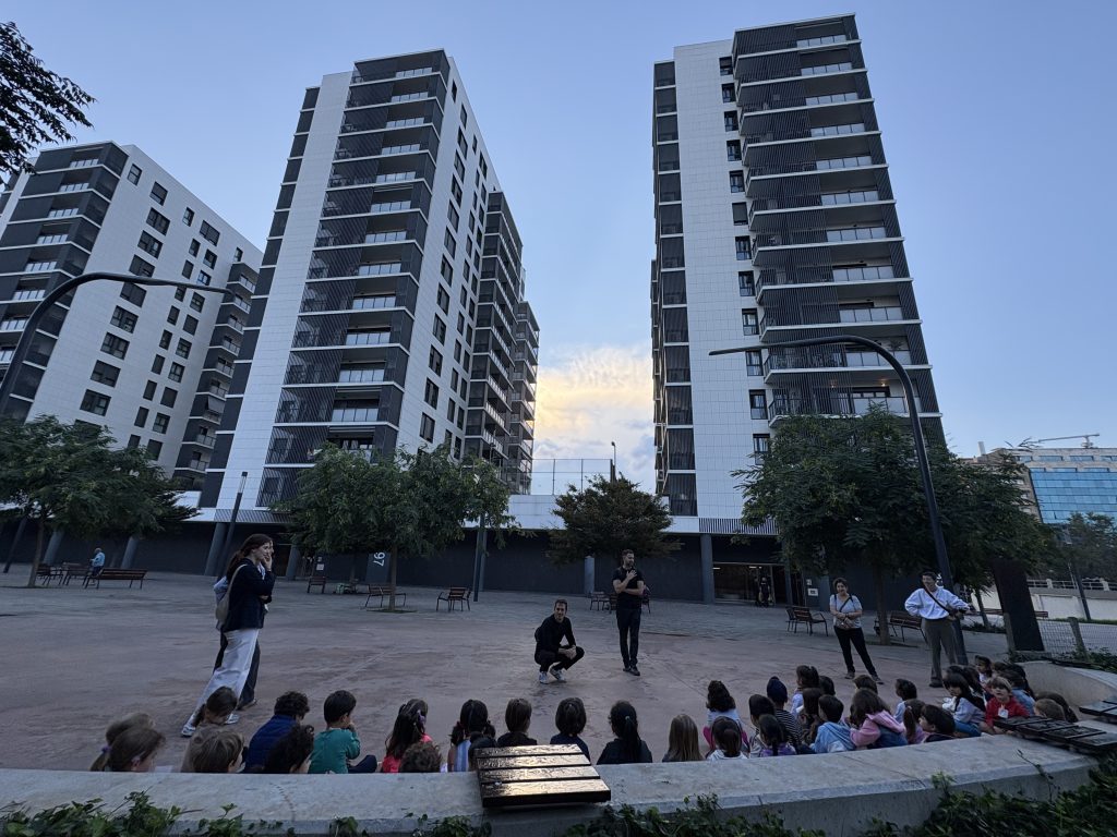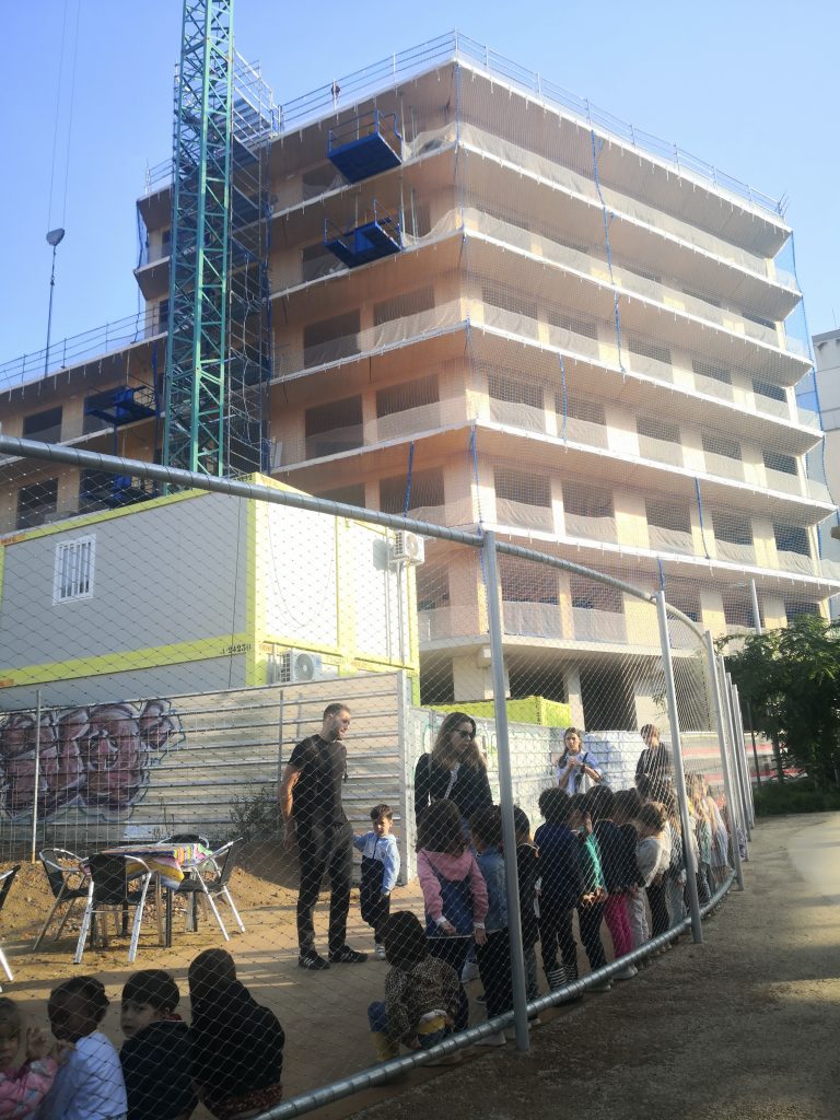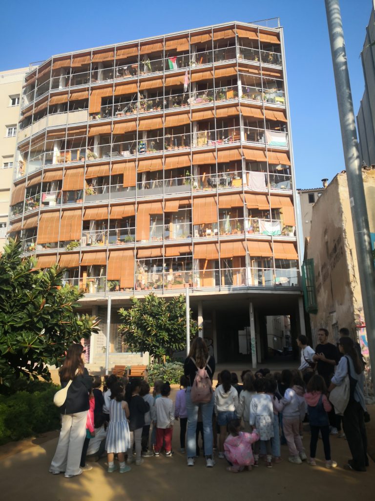 Arriba el dia d’anar a conèixer «La Borda» que és el nom d’aquest edifici d’habitatge cooperatiu. Acompanyats per les famílies que hi viuen, aprofitem el camí per anar observant diferents edificis que veiem: Com són? Quines coses ens criden l’atenció? De quins materials estan fets? Veiem que la majoria són de maons, de ciment, de vidre… i tenen finestres, balcons, portes… Abans d’arribar a la Borda, tenim la sort de passar per «Sotrac», un edifici de fusta en construcció.