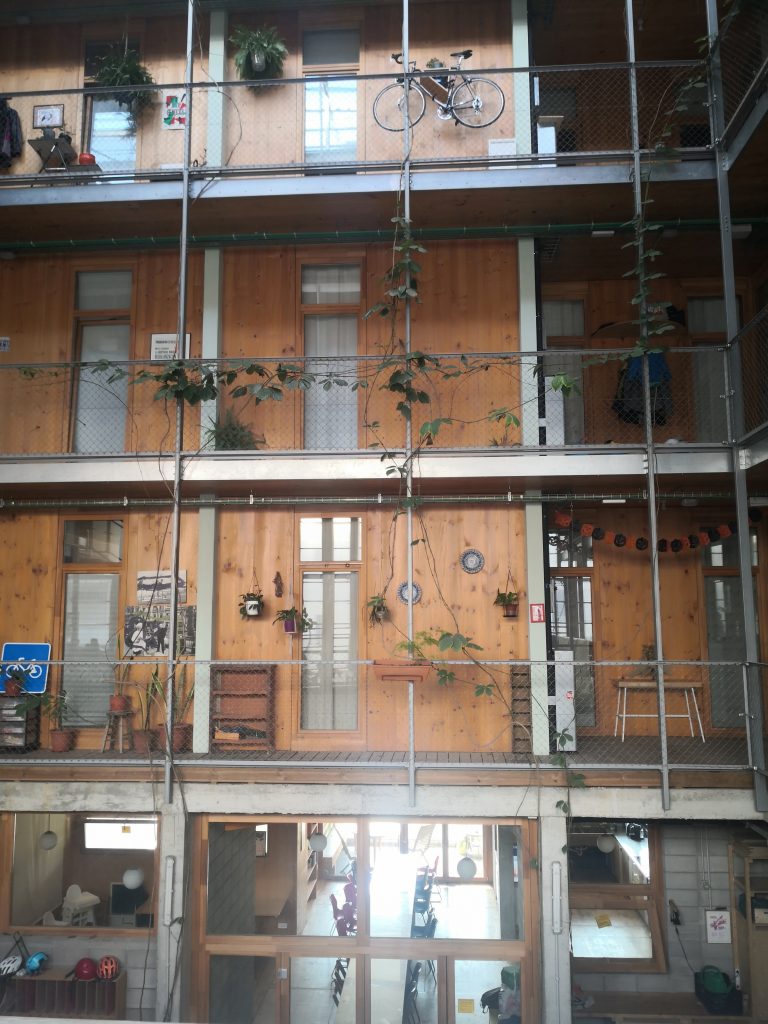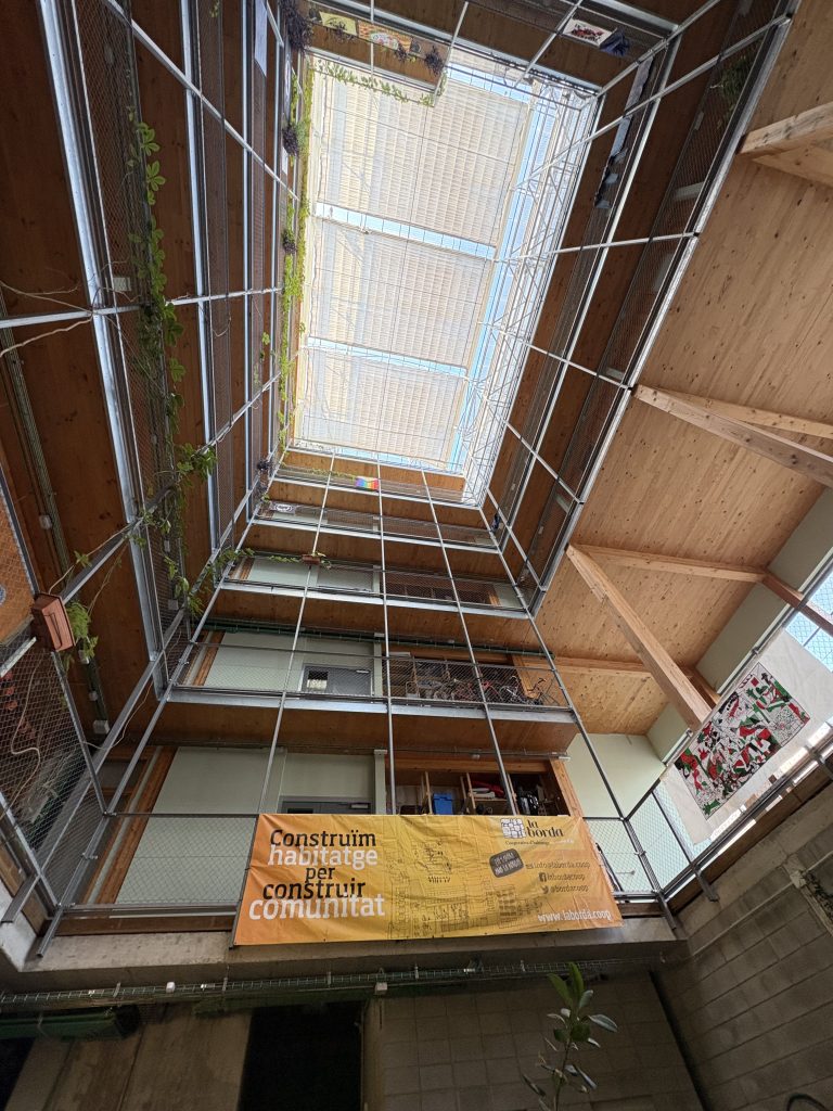 Arribem a la Borda per dins del parc de Can Batlló i veiem que té molts balcons, amb persianes i finestres de fusta i els balcons estan plens de plantes, roba estesa, taules, cadires, banderes diverses… Només entrar a l’edifici ja veiem que és un edifici diferent perquè té un gran espai on deixar les bicicletes i els patinets, moltes plantes, un lavabo, un sostre que s’obre i es tanca segons el temps que fa… I un menjador molt gran on els veïns i veïnes fan àpats junts. Així que aprofitem per fer una aturada al menjador per menjar uns bastonets i beure aigua. Després visitem la teulada i finalment la Sala polivalent que té un nom una mica estrany però és el que més ens ha agradat perquè és molt gran i està plena de joguines on passem una bona estona jugant!! Allà també hi ha unes rentadores que comparteixen tots els que viuen en aquest edifici.