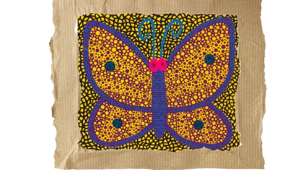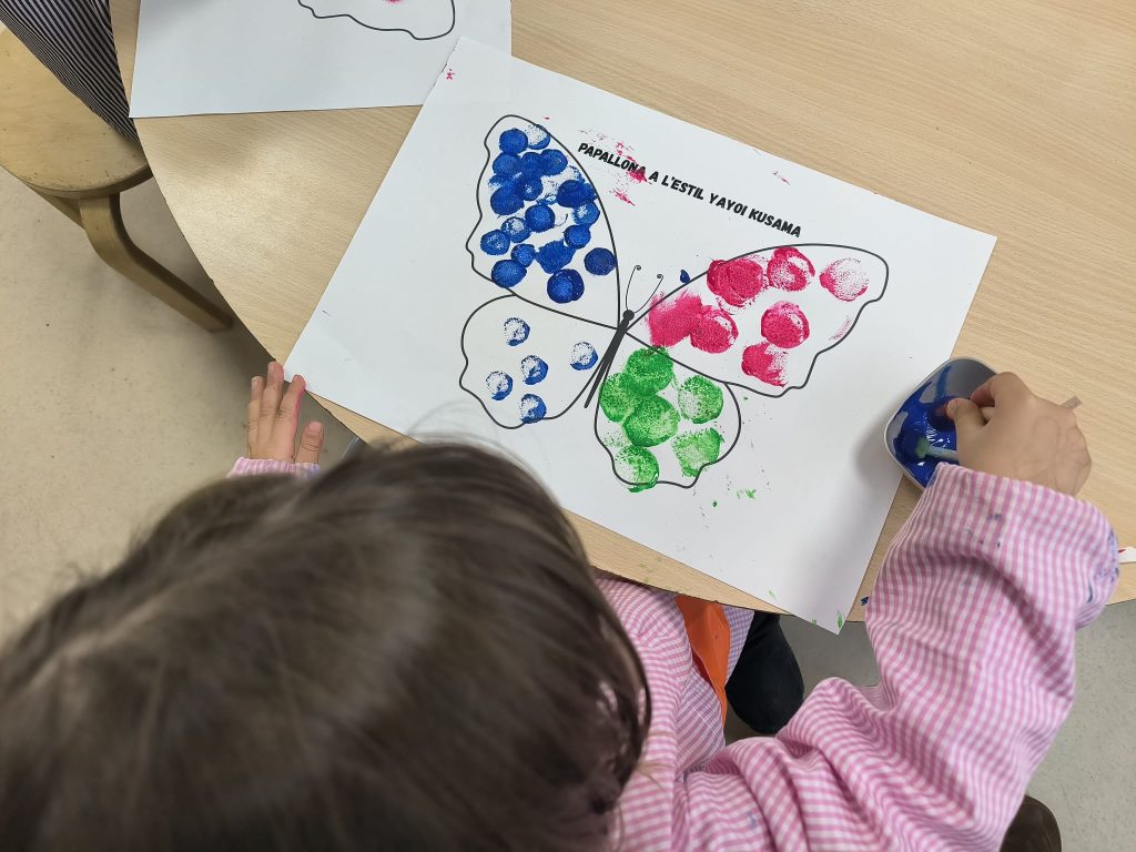 Per respondre aquesta pregunta, hem observat diverses obres on apareixen papallones. Una d’elles molt especial, feta per l’artista Yayoi Kusama. Primer vam fer una observació conjunta del quadre i vam anar descrivint entre tots i totes en veu alta tots els detalls que hi vèiem, els colors, les formes… I vam arribar a una conclusió: Aquesta artista utilitza molts punts per dibuixar.