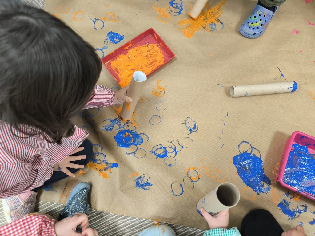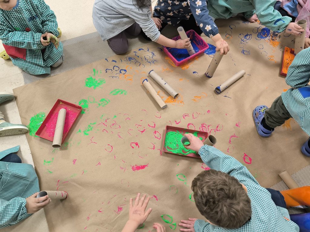 També ens vam fixar que els punts tenien forma de cercle, i per això vam crear un mural col·lectiu ple de cercles fets amb tubs de cartró.