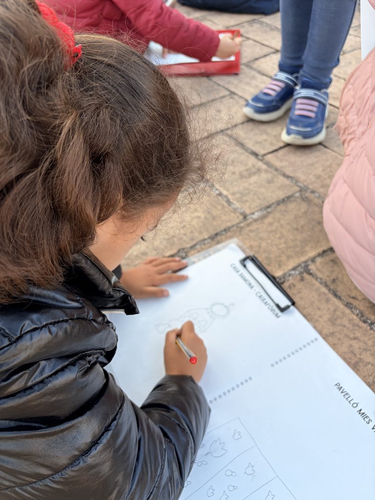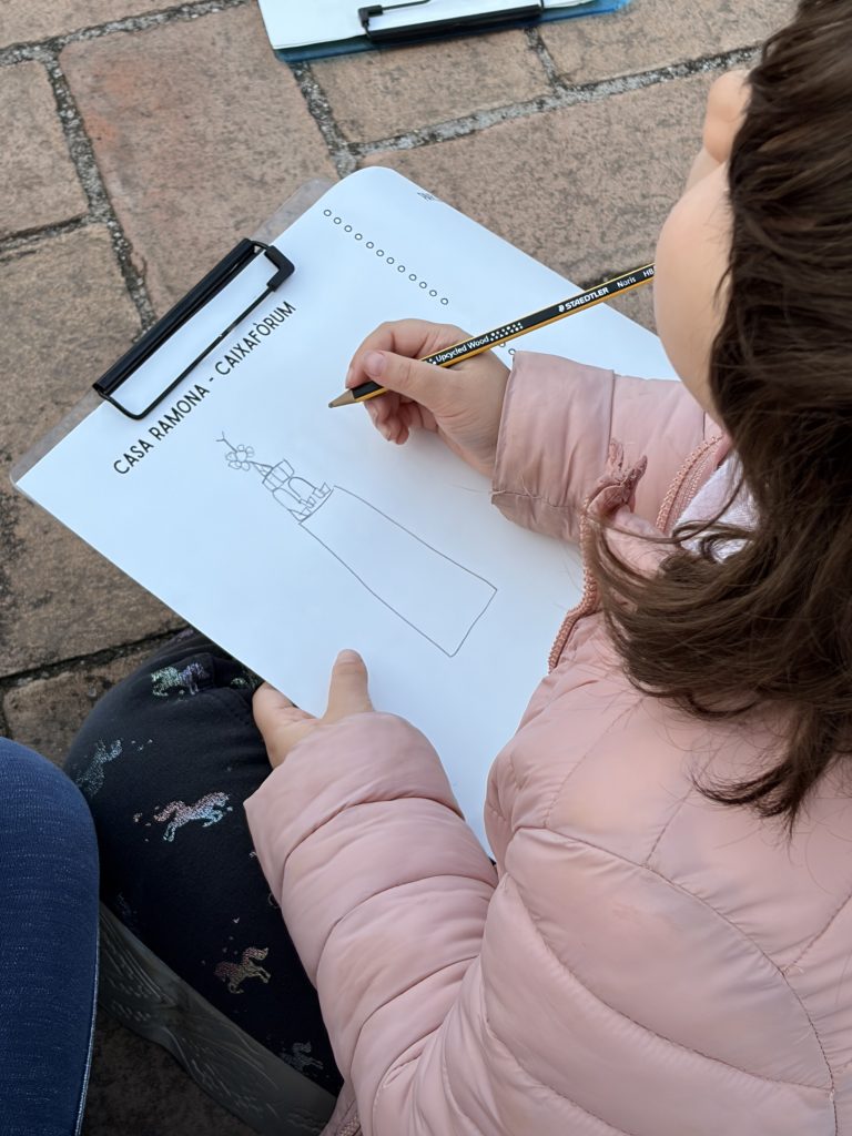 Després de parlar de la seva estructura, les sorprenents línies rectes, ja que és de la mateixa època que els altres edificis vistos fins ara, els vam dibuixar des de fora i, després, vam entrar a visitar-lo. Per dibuixar-lo vam fer servir l’eina d’observació arquitectònica, un petit visor que ens feia centrar bé l’atenció en aquells petits detalls que amb una visió general no es veuen.